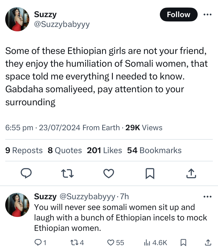 This space woke a lot of people up. Somali men have made Ethiopian women confident to diss Somali women.