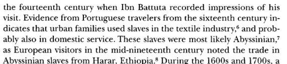 Gordon also explains that “By the beginning of the fifteenth century, the East Coast had achieved a modest degree of urban growth. Along the coastal strip between the Kilwa group of islands and Mogadishu, some thirty-seven towns managed to develop and maintain a degree of prosperity and urbanity. Because they were more conscious of their differences than what they shared in common, they were never able to unite into a single confederate or state. Several of these towns, notably Kilwa (Present day Tanzania) and Mogadishu and to a lesser extent, Mombasa, prospered. Islam, which managed to take hold on the coast in the thirteenth century, was the religion that people of these towns professed. [That means the majority of them embraced Islam]. When Ibn Battuta came to the coast in 1331, he chose to visit Kilwa and Mogadishu. He could not help observe the piety of its inhabitants. No less significant, Ibn Battuta was made aware of the large number of slavers that made up their populations. The sultan of Kilwa [Present day Tanzania], he noted, carried out frequent raids in search of slaves. So plenty were they that he presented twenty of them as a gift to an indigent faqir from Yemen. Both Kilwa and Mogadishu, in fact, owed part of their prosperity to the slaving activities carried on by their sultans” (Page 125). In analyzing this, one should understand that cities on the coast of East Africa partook in slavery using their natives in the Arab Slave Trade. Furthermore, in “The Mysterious and the Foreign in Early Modern England” by Helen Ostowich and others, she expresses “In addition to ‘white’ women slave markets of the Ottoman Empire carried African women, who were sold for either concubinage or labor. Murray Gordon, in Slavery in the Arab World, finds that African slaves women came from Egypt, Sudan, Ethiopia, and Somalia. Joseph Harris points out in The African Presence in Asia: Consequences of the East African Slave Trade that with the onset of European colonization in the Maghrib, which slowed the slave trade, African women were gathered from as far south as Kenya and Tanzania. Throughout the Islamic world, Ethiopian and other slave women from the Horn of Africa became the concubines of men who could not afford to buy a ‘white’ woman, who cost three times as much as an Ethiopian. Though not ‘white’, Ethiopian women were considered the ‘second best’ option because their facial features and skin tone were seen a somewhere between ‘white’ and ‘black’ and therefore were marginally acceptable” (Page 62-63). Again, we must realize that the borderlines of geographical names did not inherently limit the locations of ethnic groups in East Africa, as I said previously Somalis spill well beyond the physical boundaries of the nation state Somalia, into “Ethiopian” “Kenyan” “Djibouti” areas, etc.