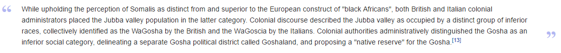 I think that this reflects the attitude that Western nations would take today in regards to this inherent sense of superiority the Somalis have. In fact, they actually are aware of the divisions between Somalis and Sub-saharan Africans; the USA made the expatriation of Somali Bantu populations from Somalia a priority during the civil war (