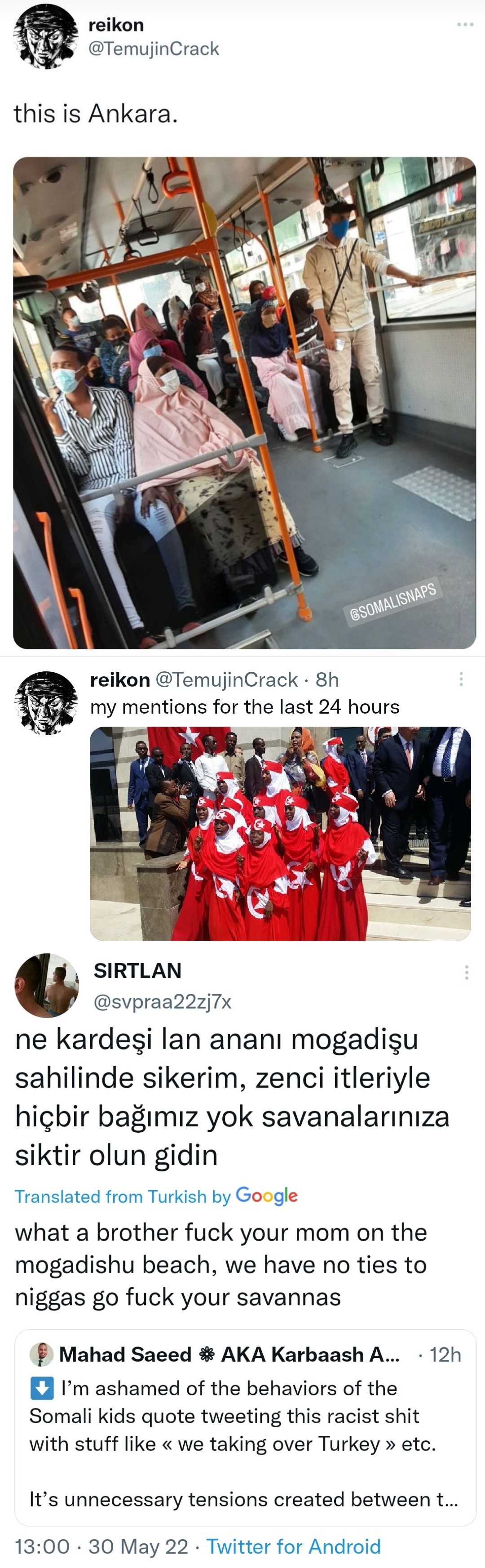 They really dont mind letting out the racism and looking like complete imbeciles all bc of a troll, I like how they say the troll is causing racism, like they weren't racist beforehand, it's not like what a single trolls posts will turn one into a racist, shit, you have to be a racist beforehand to shoot back and dehumanise an entire race. Or when they got told Turks also live in Germany, etc, as migrants. They claim stuff well we came legitimate through work contract, but really no one cares, ultimately because just like these somalis they too are similarly a despised minority,