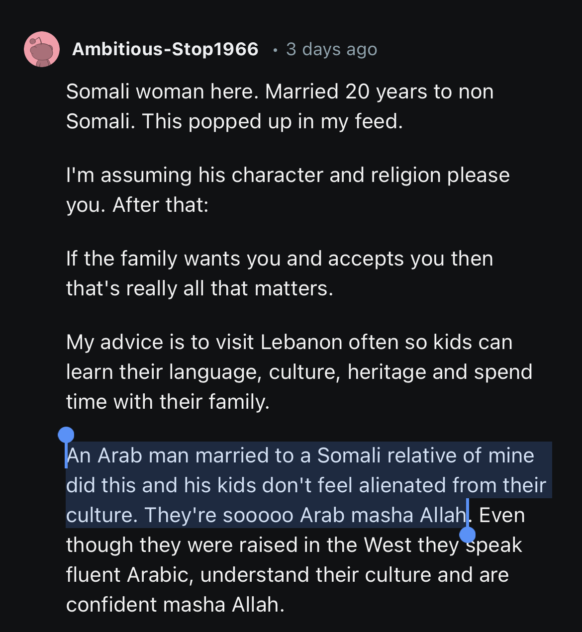 That contradict itself tho? How can u belief system that promotrs bein exclusive but then practise inclusivety bc of your culture??? I just think Somalis just like all black people are very welcoming to lighter shaded people, this is a thing in all cultures tbh.