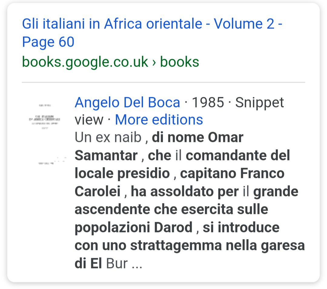 "An ex naib, named Omar Samantar, whom the commander of the local garrison, Captain Franco Carolei, hired for the great ascendant he exercises over the Darod populations, introduces himself with a stratagem in the garesa of El Bur"