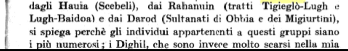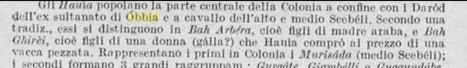 The Hauia people populate the central part of the colony on the border with the Darods of the former sultanate of Obbia and straddling the upper and middle Scebeli. According to a tradition they are distinguished in Bah Arbera, i.e. children of an Arab mother, and Bah Ghirei, i.e. children of a Galla mother. Which Hauia I buy for the price of a vaca pezatta. The Murisadas (Middle Shebels) represent the first in Cologne; the latter form 3 large groups; Gurgate, Giambelli and Guggundabe.