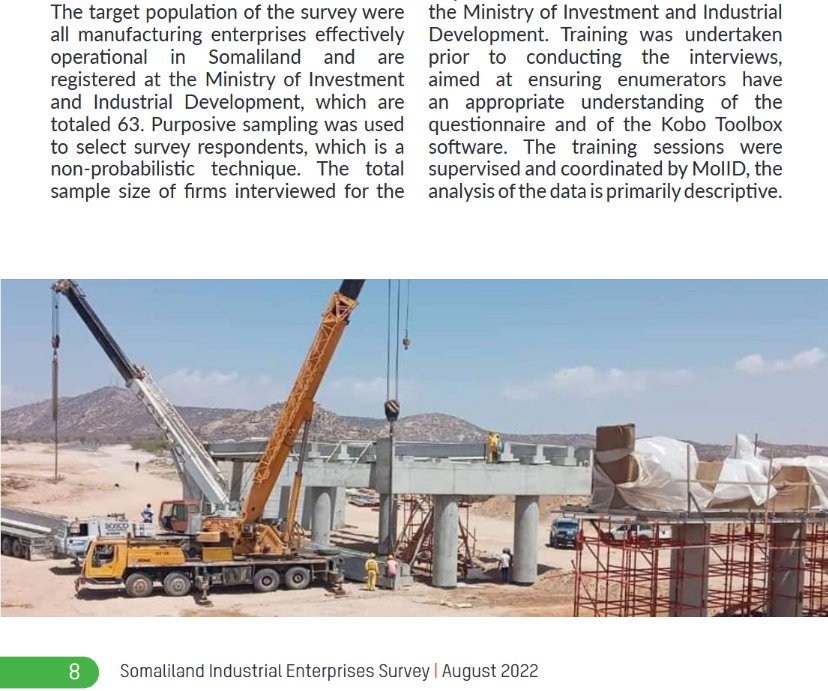 According to a 2022 survey, there are 63 industrial enterprises in Somaliland alone. The average starting capital was $2 million mostly from local sources with the highest investments ranging between $15 and $32 million.