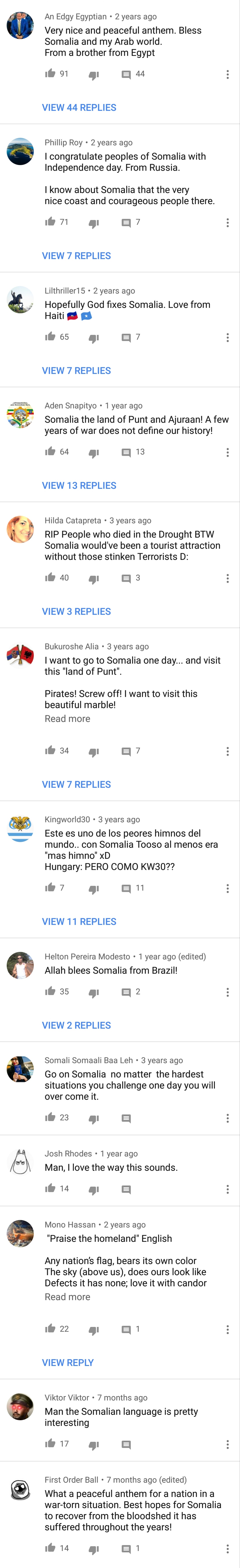 Bro just look at the comments it's like night and dayThe Somalia national anthem ( Qolobaa calankeed) composed by an HY guy is much better.