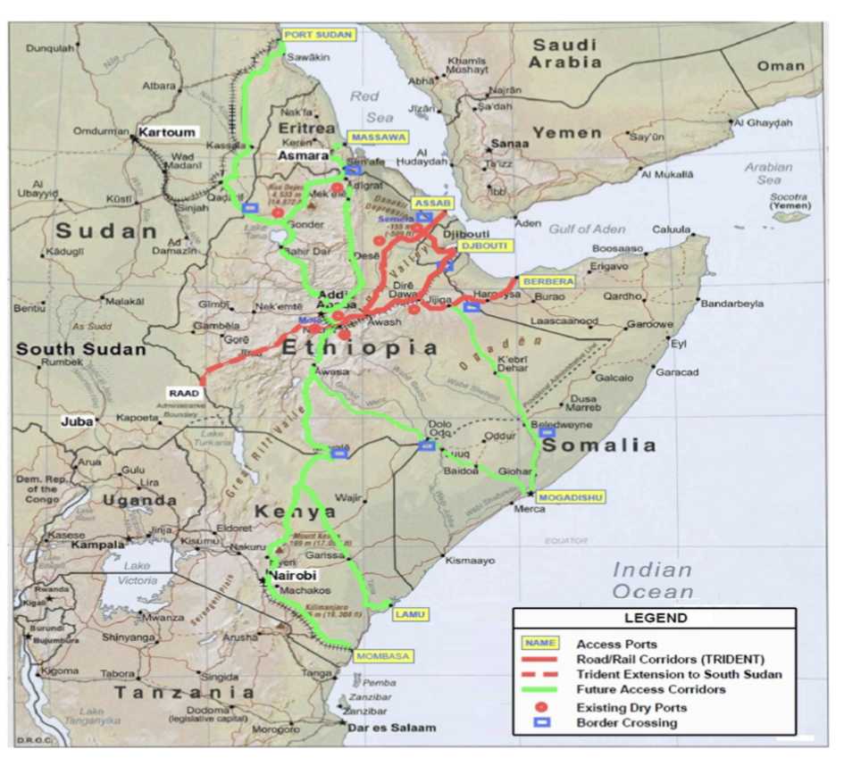 Trade corridors: Addis-Dolo-Kismayo, Addis-Jigjiga-Garacad, Nairobi-Garissa-Kismayo etc..
