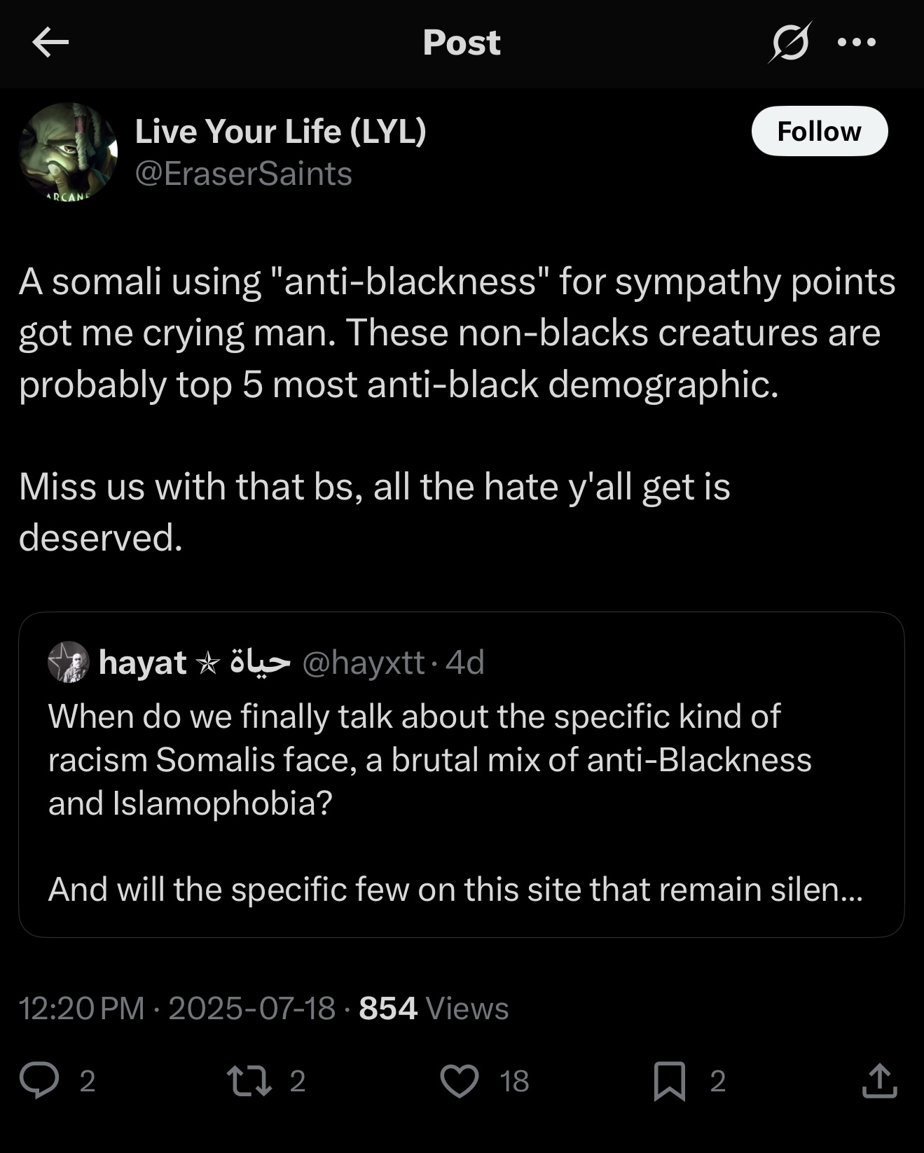 Seemingly Somalia serves to be the scapegoat for Africa’s colorism and texture issues. The sense that likely ALL cultures around the world don’t have beauty standards such as lighter skin or looser hair only exists to be Somalia using their logic.I have been seeing some strange tweets like this one. Can we discuss how hypocritical these people are? Many of the people trying to call us out have made antiblack comments. Thankfully people are pushing back against this
