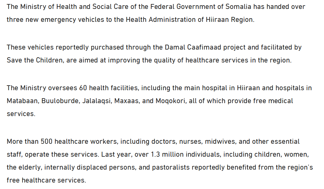 The Ministry of Health and Social Care of the Federal Government of Somalia has handed over three new emergency vehicles to the Health Administration of Hiiraan Region. These vehicles reportedly purchased through the Damal Caafimaad project and facilitated by Save the Children, are aimed at...