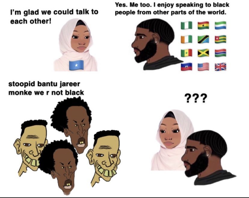 It’s a collective thing, the inceIs, the Dabaal BLM xalimos dragging their own - there was a room with thousands of people all over the world where the girls who were Somali were saying all antiblackness comes from Somali males, and one even was arguing how EVERY single positive thing about somalis is cause of the women, and negative was cause of the men - in a room full of people all over the world, most of the people laughing and agreeing