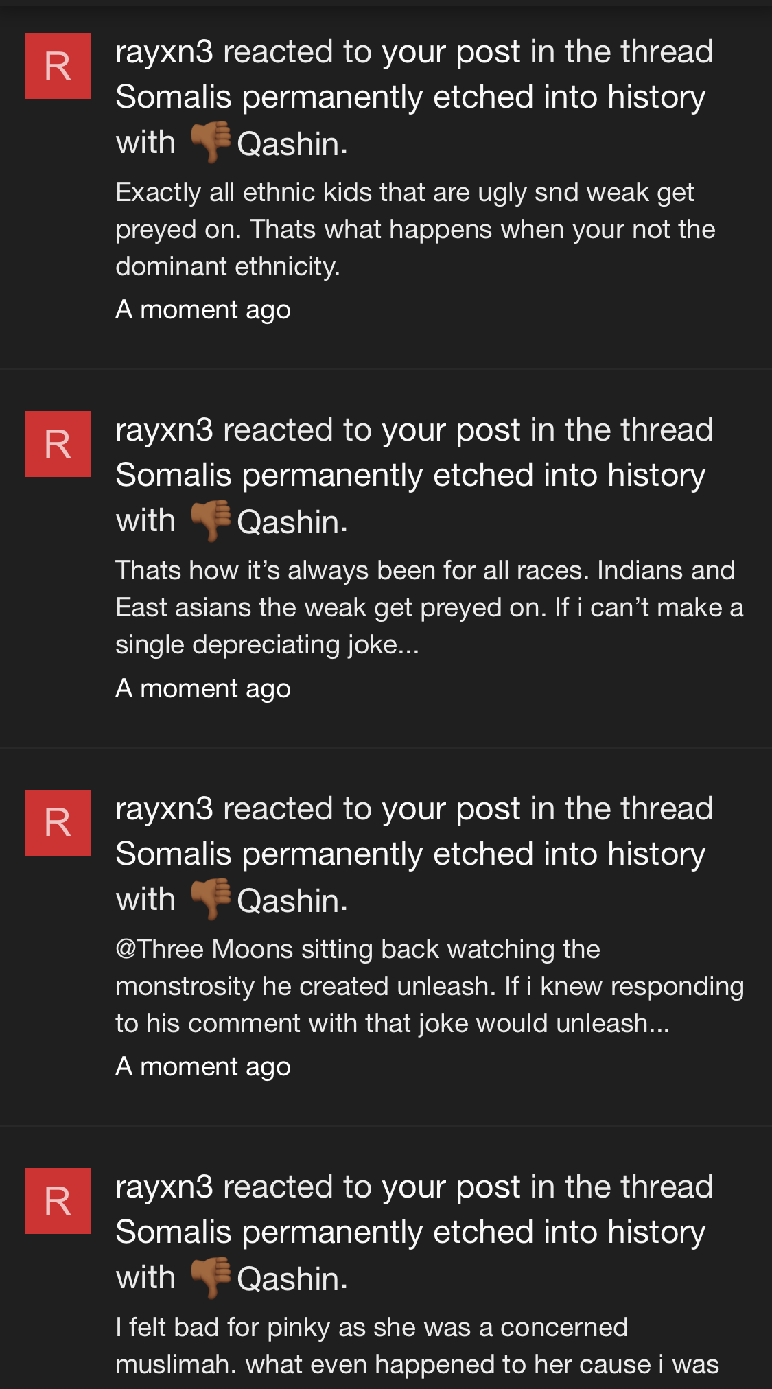 You sound like a self hater . I have nothing against you but please deal with youโre issues before coming on this forumItโs Somali guys that get bullied for being Somali everyone knows this. With barkhad abdi, yusuf, diddy, etc. Somali women are the only tolerable and likeable people from our community. Itโs a shame we have to share an ethnicity with you guys. I wonโt reply to your cringe posts from now on. Seek help.