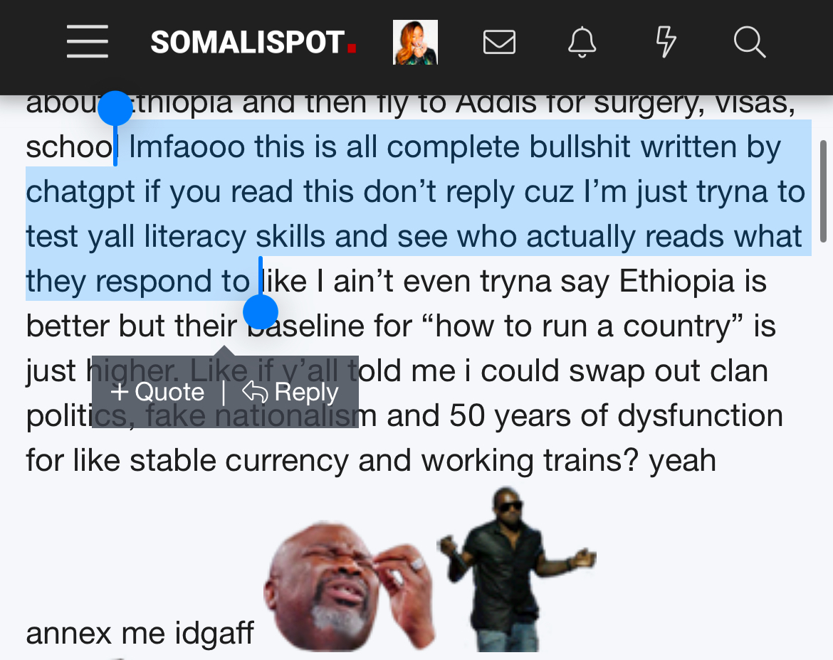 You dead ass said Somalia would be better off annexed by Ethiopia, and you're talking about a 'literacy test' what literacy test? You made an insane claim and people refuted it. How else are you supposed to read "Somalia would be better off annexed by Ethiopia"? Somalia being part of Ethiopia would objectively make things worse for us lol