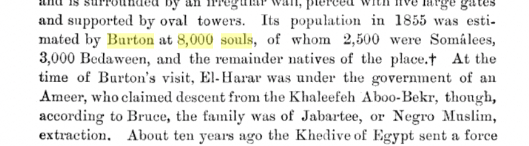 According to Richard Burton who visited in 1855, Harar had a population of 10000 inhabitants of which 2500 were Somalis.archeologist literally disagree with u, these so called ''harari'' group never existed what u people smoking, the city was soley inhabited by somali as early as 1814 before abyssnia genocided them from their land