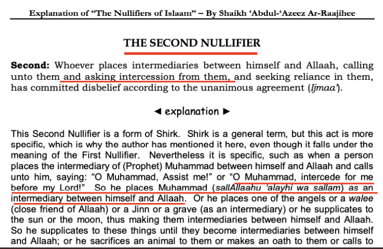 Your statement and certain assertion that the one who says "O Messenger of Allah, I ask for your intercession" is a polytheist whose blood is to be spilled, necessitates that one affirms the disbelief of the majority of the [Islamic] nation (Umma), especially the later ones [from among them], because their relied upon scholars have said that this is allowed and attacked the one who opposed in this [issue].