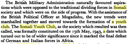 SYL or as it was known SYC was founded in 1943 by the help of the British military administration in the Mogadishu during WW2