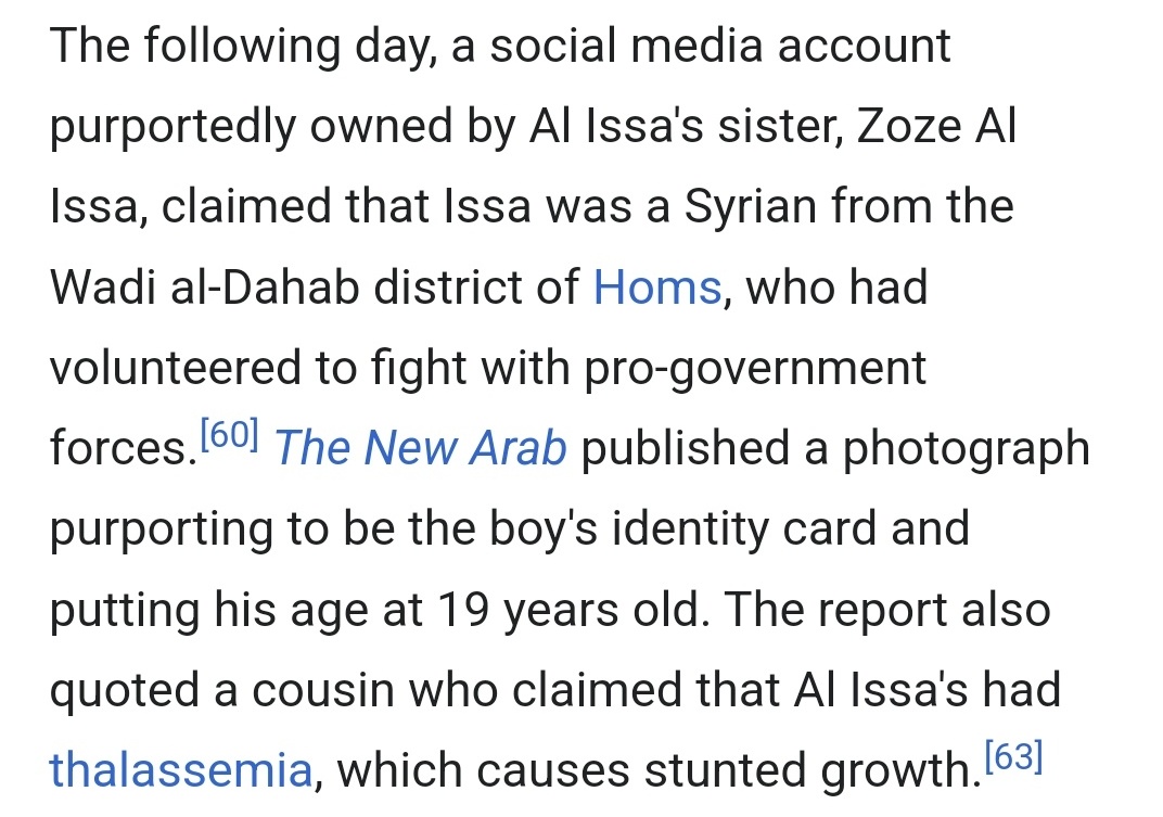 That is not a 19 yr old even with "stunted growth" the SM accounts purportedly his sister and the report quoted a cousin? From where, they didn't verify these individuals at all. I'm inclined to believe Syria I'd better of understanding Assad.
