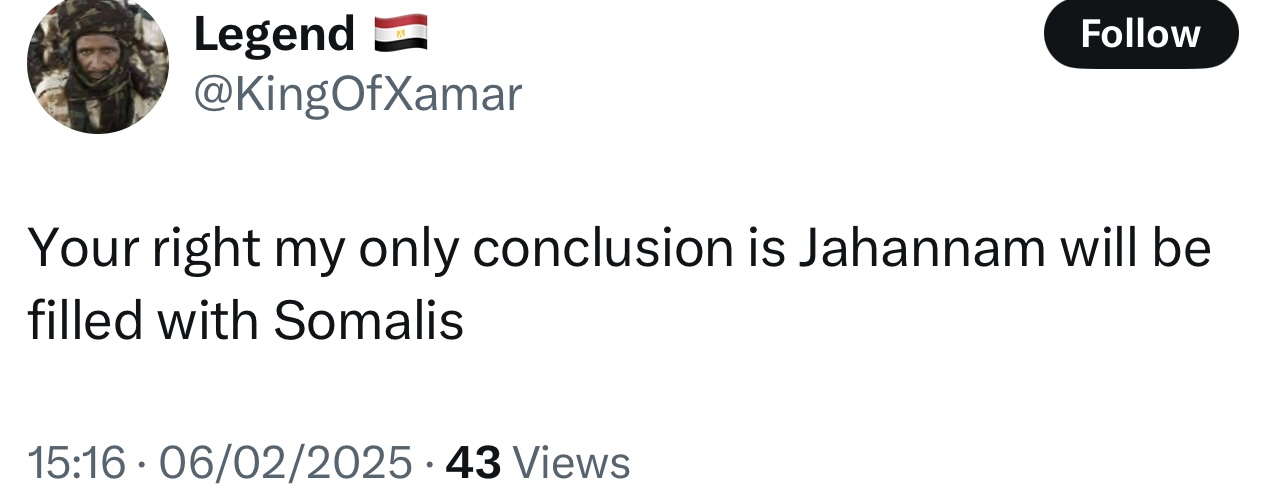 I have even seen some of them say that Jahanam will be filled with Somalis just because some of us spoke out against those vile comments. Just look at the flag in his bio too.