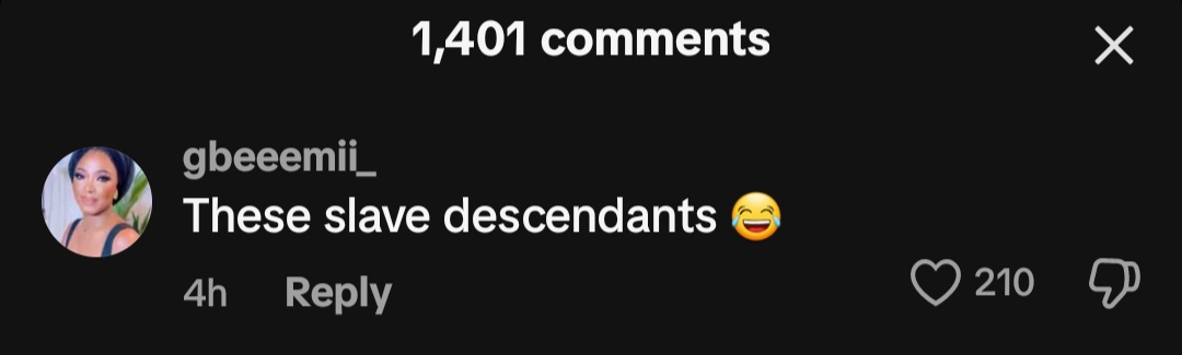 That’s completely unacceptable, racist, and disgusting. Especially when Nigerians were heavily involved in the transatlantic slave trade, the very trade that tore Black Americans from Africa and forced them into slavery. Using that brutal history as an insult is not only ignorant but deeply offensive.