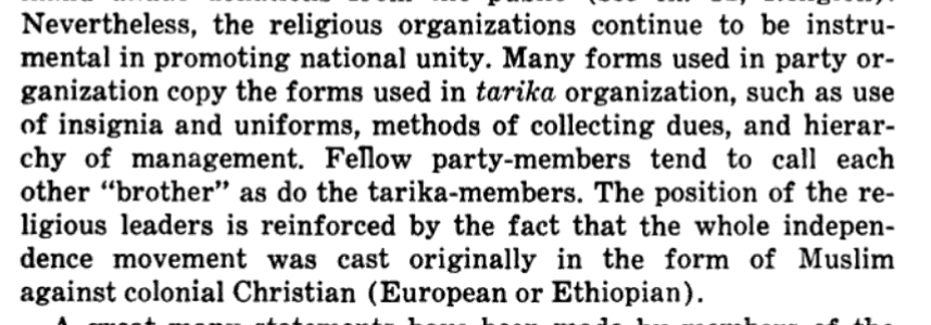 The Tariqa's were instrumental in promoting national unity. It strengthen civic cohesion and that the earlier versions of SYL and other independent movement copied its organization forms and even started to implement things like uniforms or insignias.