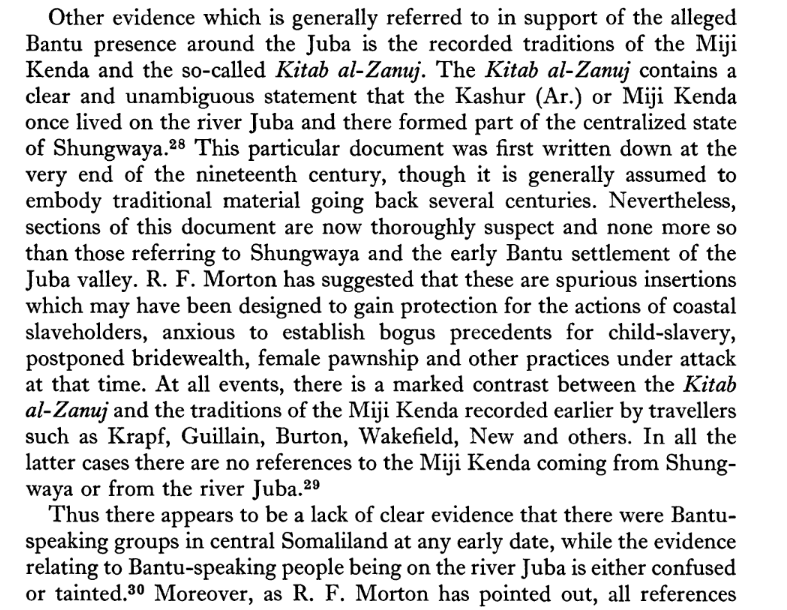 "Thus there appears to be a lack of clear evidence that there were Bantu- speaking groups in central Somaliland at any early date, while the evidence relating to Bantu-speaking people being on the river Juba is either confused or tainted.30"