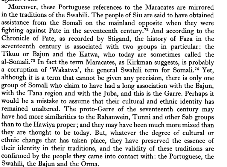 I am confused here my freind, again he is just telling us we cant be for certain the Maractes were somali and as he explained before the Katwa were Bajunis. Stiles, Daniel claims the Aweer a people whos language has some similarities with Afaan Borona fled to the Bajuni islands and lived with the Bajuni these people (Bajuni/Aweer) were the real wakatwa not to confuse it with the Somali people.