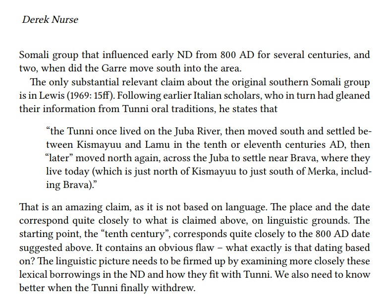 This view by Turton has been strenghtened by newer archeological and linguistic studies that there has been continuous Somali presence in Northern Kenya before they came in contact with ND(Northern Swahili speakers) and it was Southern Somali speakers like Garre/Tunni that spread out from Juba around 800 or earlier.