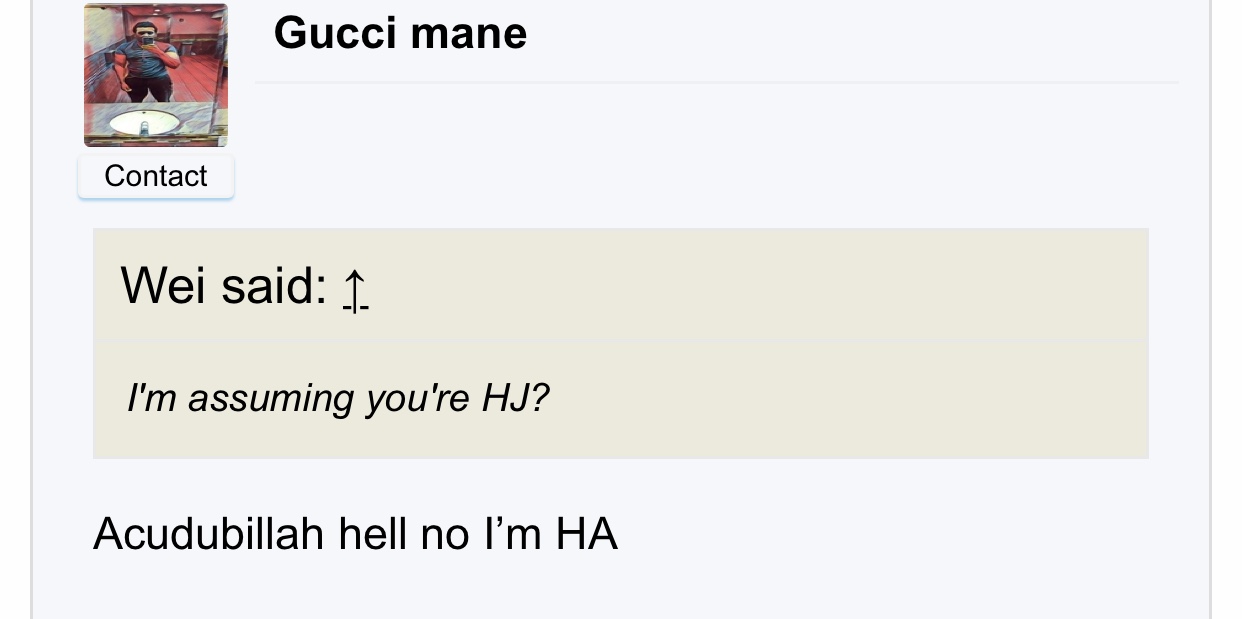 @Wei asked me if I’m HJ so I replied how is that attack on HJ? Have you taken your meds today? Btw this my last reply to you since your clearly not mentally stable. Later :heh: