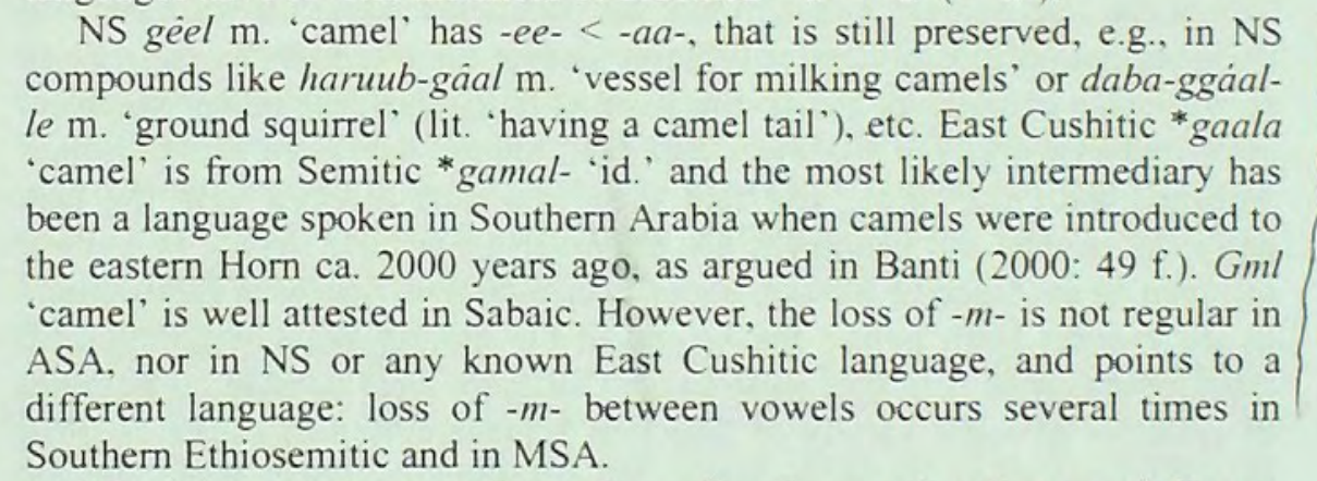 The presence in the linguistic depths in Somalis goes to when the Somaloids coalesce in the proto-Sam (as my source stated and underscored by what you posted) - this is only a couple of centuries prior to 0 CE (we're not talking archaic here). Arabians had it earlier, got the wild version, got a depiction of it in their rock art earlier, etc. The genetics of all the camels are related. Separate domestication would mean a wild version of them roaming around in the Somali peninsula showing divergent genetic regionalism from the rest of the world. I think it is best to be rational about this. The earliest evidence of the fossil record in burial sites in the north coincides with this showing the 1st century, the rock art was the latest also attesting to a 2100-1600 time-line. This is fairly rigorous and comprehensive.