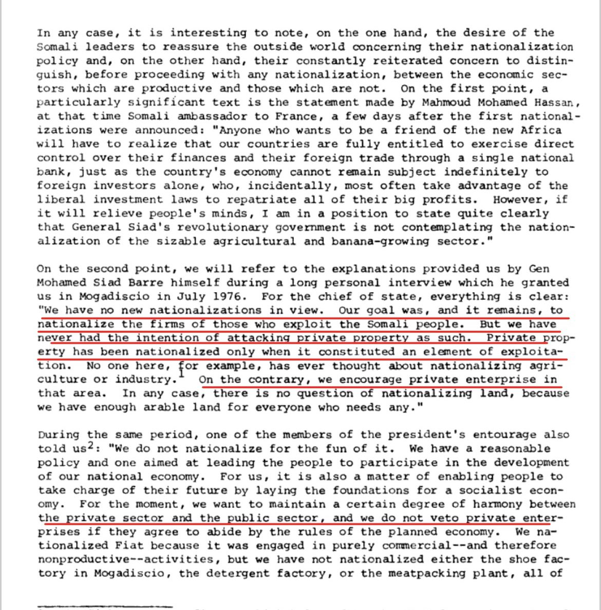 "We have no new nationalizations in view. Our goal was, and it remains, to nationalize the firms of those who exploit the Somali people. But we have never had the intention of attacking private property as such Private property has been nationalized only when it constituted an element of exploitation”.