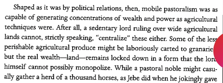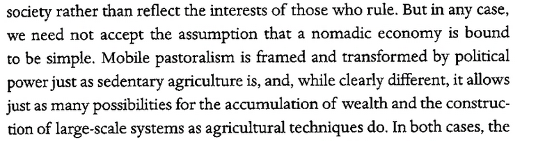 They can’t grasp this complexity: pastoralism can generate as much wealth and power just as farming. People can form states and complex political systems from it.