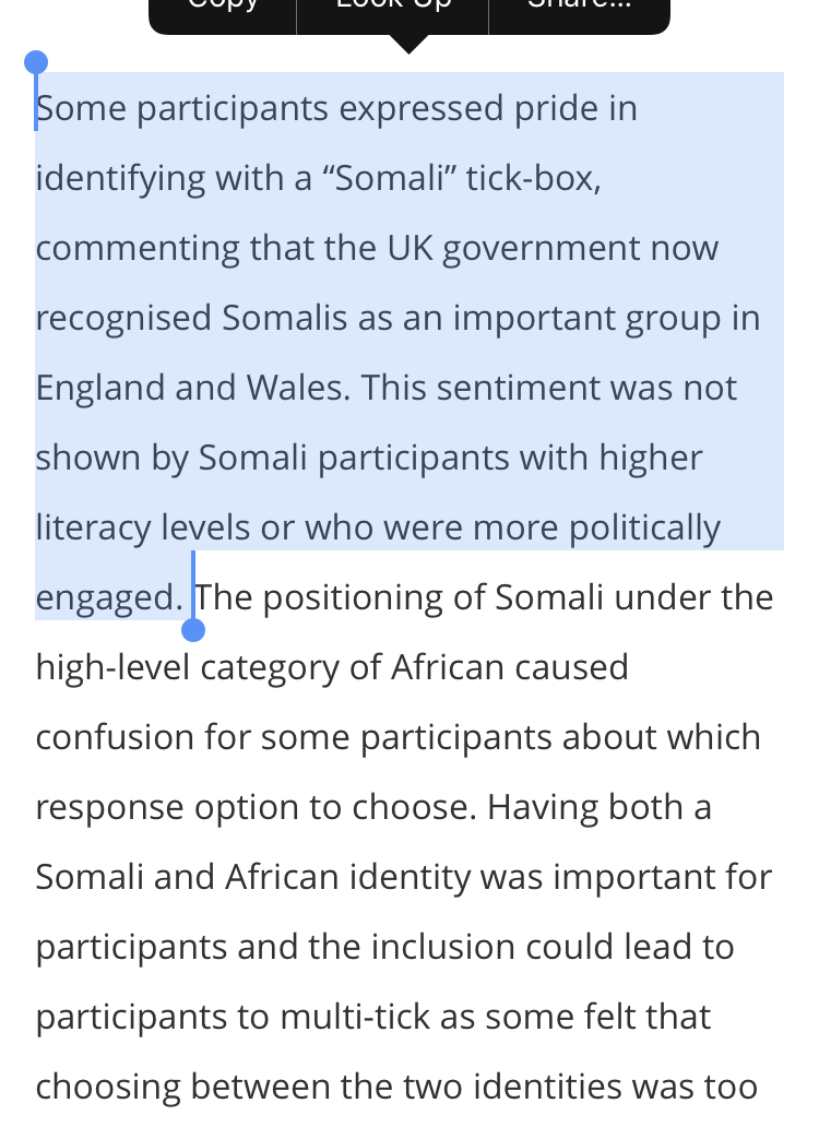 also find it funny how they want to be removed from blacks, when thats basically one of the only identities saving us, seeing as somalis asa whole aren not as educated as a stand alone community like say nigerians, let alone putting somalis against ALL black/african people. This can go wrong in so many ways, and in ten years there will be a new set of UK Somali data people will always use to disparage them, as the census might read something like 100k somalis but officially only like 30k are working or something.