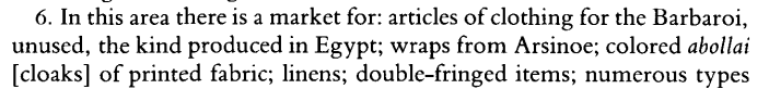 As for the Periplus, when it talks about cloaks it was clearly not referring to this, Im pretty sure it depends on the translation of the word, some say robe some say cloak, and periplus also says Somalis from barbaria also imported the same low quality robes colorful robes from arsinoe in egypt