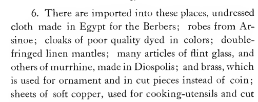 In the same section, it mentions raw artifacts with attribution to their production origin, Diospolis. And the Barbar clothing worn by the Bejas of that region was imported from Egypt.