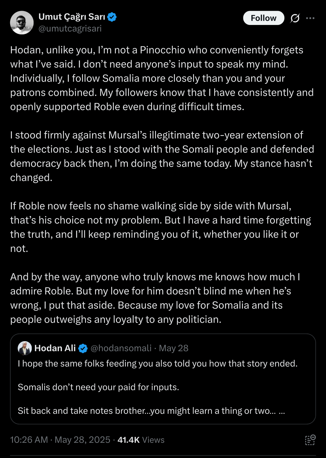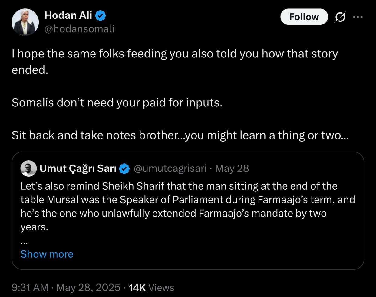 I cannot stand Hodan because she was part and parcel of HSM’s government and she’s suddenly opposition when she got fired. However, I can tolerate her because she’s a Somali woman over that foreign agent. Why is he acting like the average Somali benefits from Turkey outside of Mogadishu?