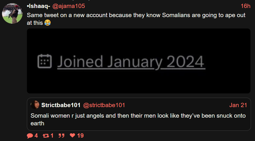 My best guess its a  Somali behind it or someone from this forum behind that account seeing how you guys love to market the so called ''hate'' on daily on here and trying to farm/bait outrage over it. No one would be invested in something like this unless they are part of making it and enjoy it.