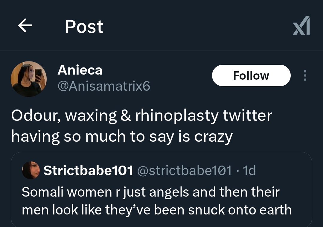 You cant even do that and be on somalispot, because ppl bring that stuff here.I think this is my sign to delete Twitter. I can't see content like this any more, it's full of negativity and people crossing lines that should never be crossed. I'll be on Pinterest, my well-curated YouTube feed, and Netflix instead.