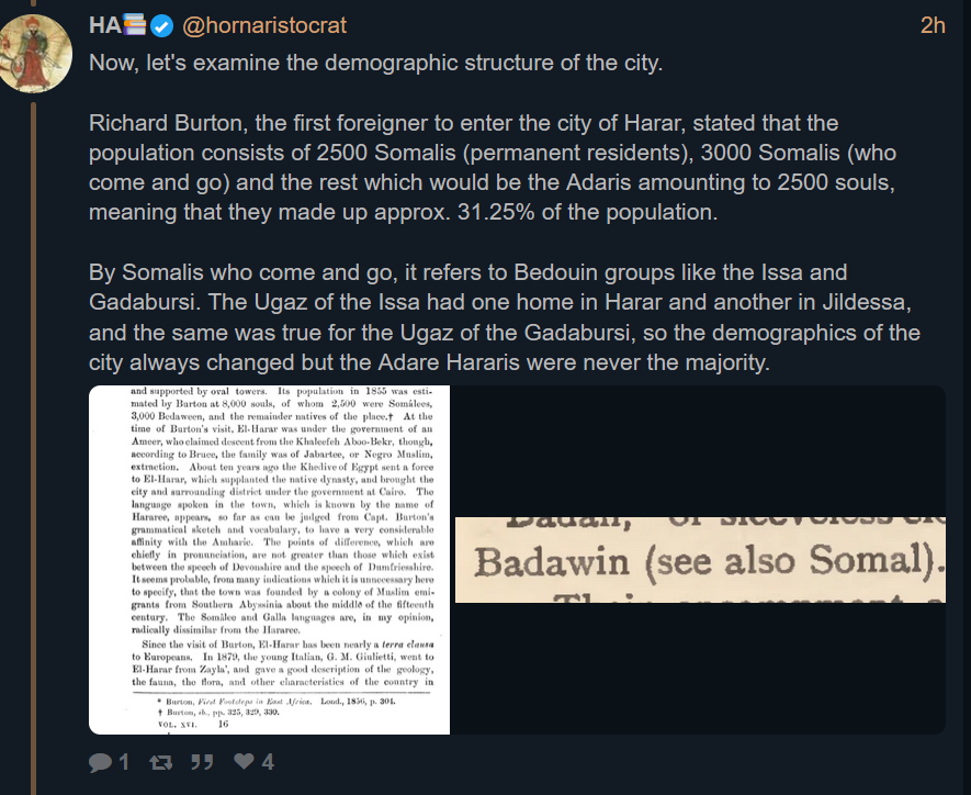 On old maps, you will see various Somali clans named around the city, practising agropastoralism, as the Oromo pushed into the surrounding lands you see these groups go back to areas close to their ancestral land, for example, the Gadabuursi went back to Harawo due to the insecurity outside the walls, you still can't trust Oromos, had a relative who lived amongst them who got murdered 2 years ago, he was married to Oromo, he got killed just for being Somali and owning land.In the thread he pointed out that the Bedouins he was referring to was Somalis and it was Somalis in the area that would have seasonal secondary homes in Harar.