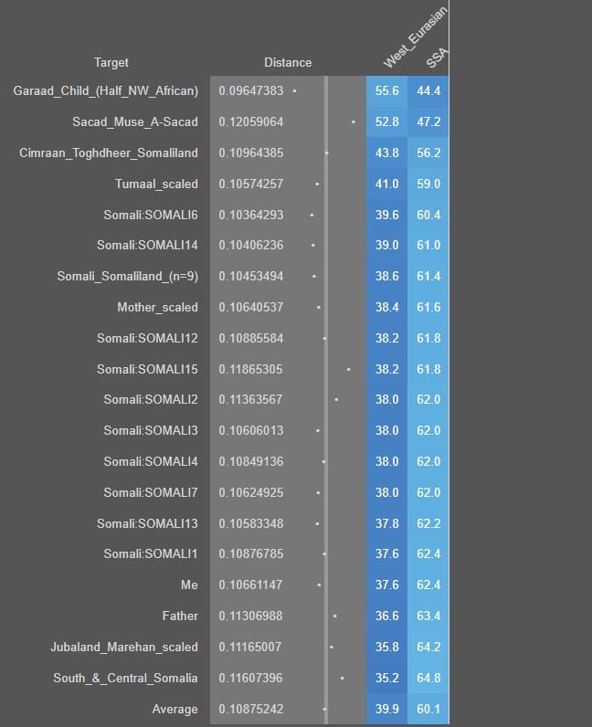 I've seen hundreds of samples from all the regions since before you even entered the population genetics sphere and yes; 90%+ of Somalis cluster pretty tightly regardless of region in terms of MENA to SSA scores as the above pretty much imparts, and you know it. Sorry @The alchemist and myself ruined your "uber Arabian ancestry diversity" belief in that other thread but don't bother me with this kind of nonsense again, please.
