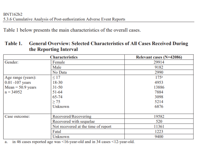 Please tell me why 520 individuals recovered from their adverse event but had a long-term disability. There were 11,361 not recovered at the time of the report. About 27% of individuals have not recovered from their adverse event, while 1223 died. If we take these figures together, 31% of individuals either died or had a long-term or permanent side effect from this injection within the first 3-months this vaccine was rolled out (in the report). Of course, we could always blame that on COVID, climate change, pollution, too many freedoms, or whatever other excuses they can come up with.