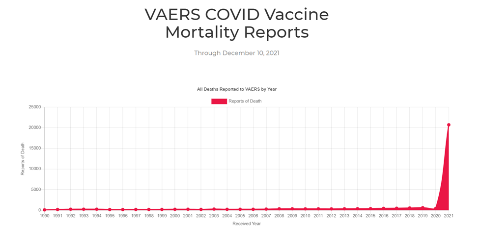 • This is an anecdotal reporting system, but there is gross underreporting even then. Its telling that even with this low number of deaths (20,000), they amount to more fatalities than an aggregate of all US vaccine deaths reported in the past 30 years (OpenVAERS, 2021).