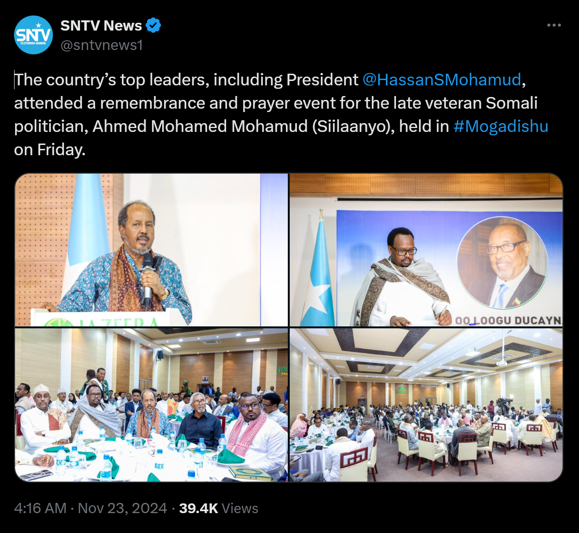.A condolence ceremony was held in the Somali capital for the death of SNM separatist leader Ahmed Silanyo, who spent most of his time fighting against the Somali state and worked with Ethiopia to dismantle the territorial integrity of the Somali Republic.