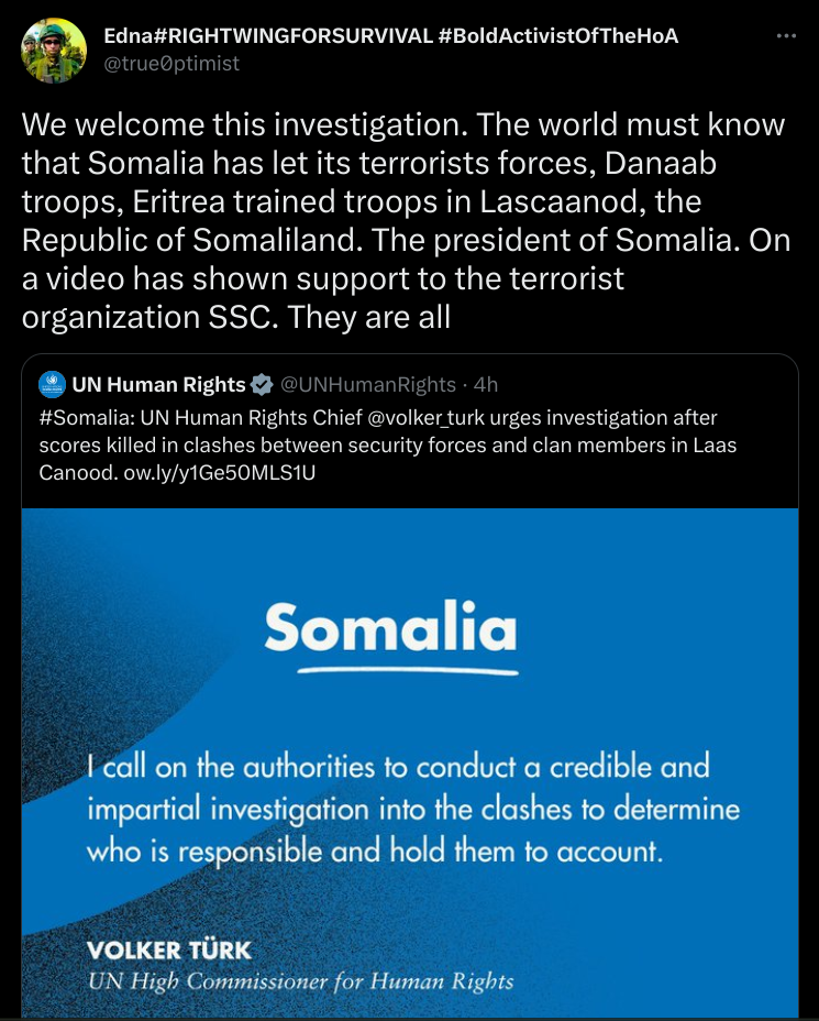Only a Burundian chimp like yourself would fall for that fake Twitter, no one else would.I’ve gotta give it to Isaaq, they fully have the international community on lock. Their propoganda machine and media influence is stronger than any other group in the horn