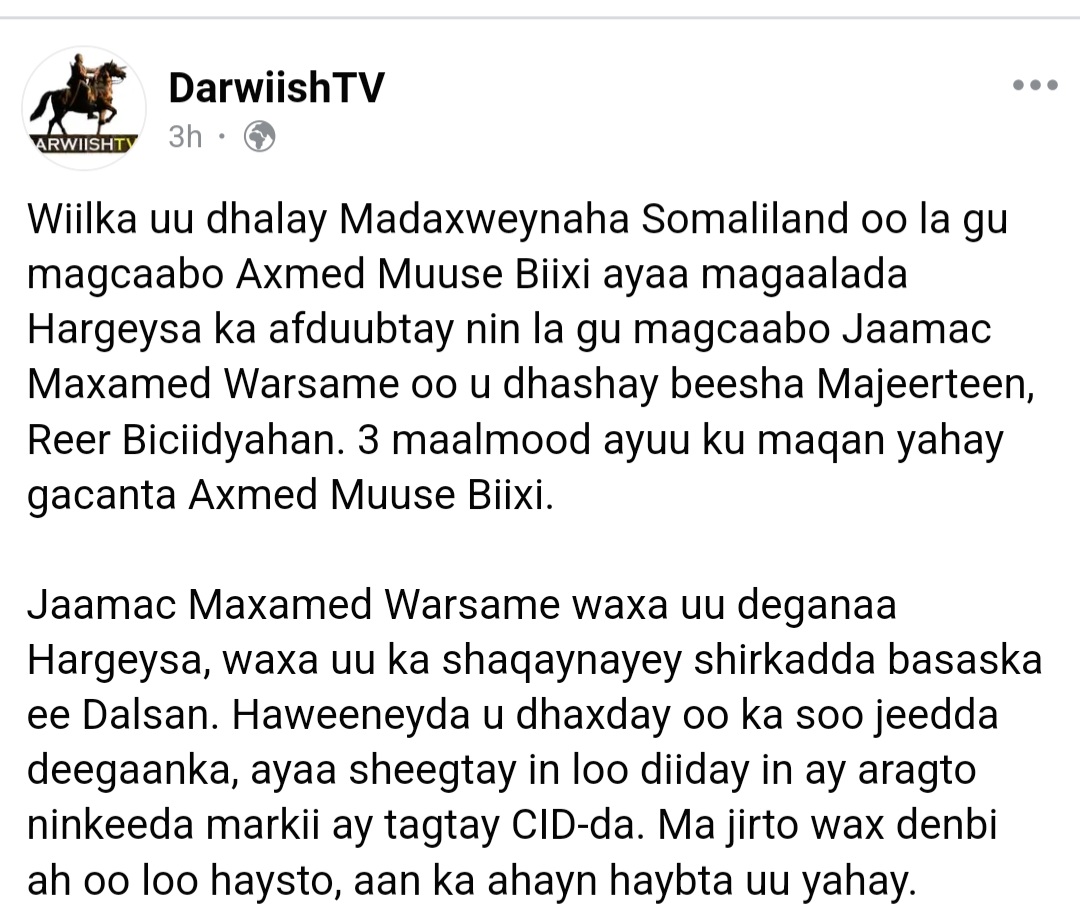 Not sure what he was thinking remaining in Hargeysa when Jigjiga is right there, hunger for more profits caught him lackingI have run out of sympathy for our people who are in the terrorist triangle. Muuse Biixi's son kidnapped an MJ man, his wife is Isaaq of course. Instead of escaping the triangle, he stayed behind throughout all of this. His wife has been refused access to him and he is being unlawfully detained.