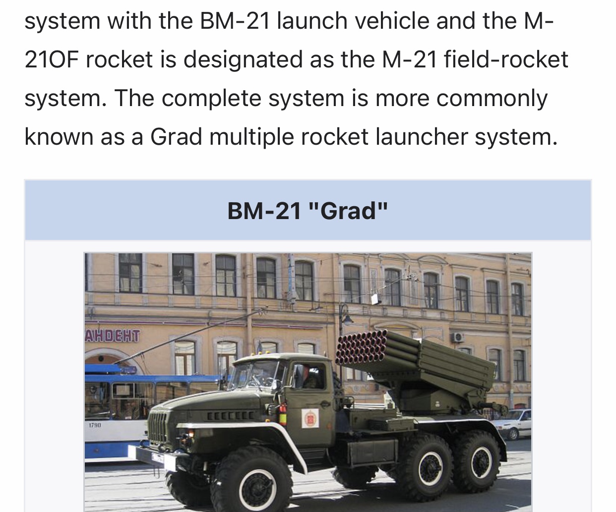 The BM-21 "Grad" (Russian: БМ-21 "Град", lit. 'hailstorm') is a self-propelled 122 mm multiple rocket launcher designed in the Soviet Union.[9]