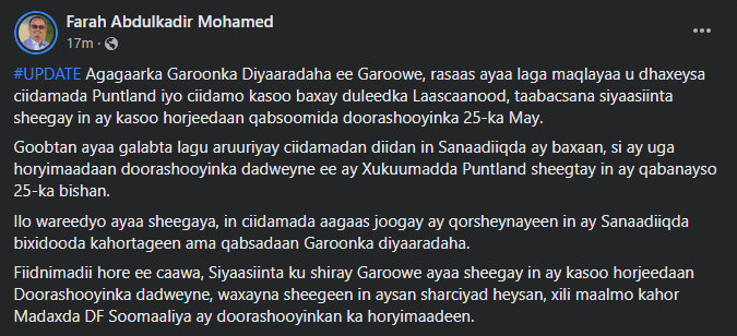 I lowkey agree with Aaran Jaan, implementing 1m1v while 6 months remain of the presidents term is not acceptable. Faroole wanted to hold 1m1v in his last 6 months and ballot boxes were destroyed in Qardho, now it’s payback. The administration destroyed the democratization process by their endless postponements.