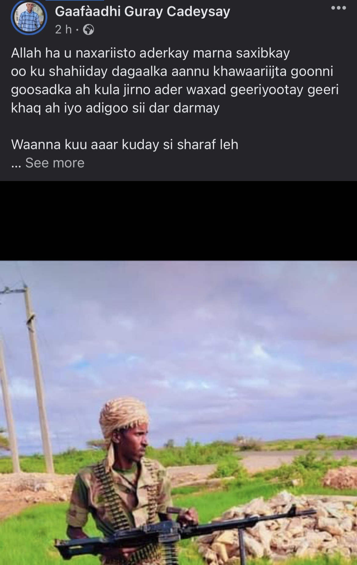 Kalay how dumb are u, how's that gay speaking American accent? He's clearly crack head iidoor who learn few English line u illiterate, canbaashe soldiers have been dealt with months ago there's no dhulbahante in sl army stop making up fairytales