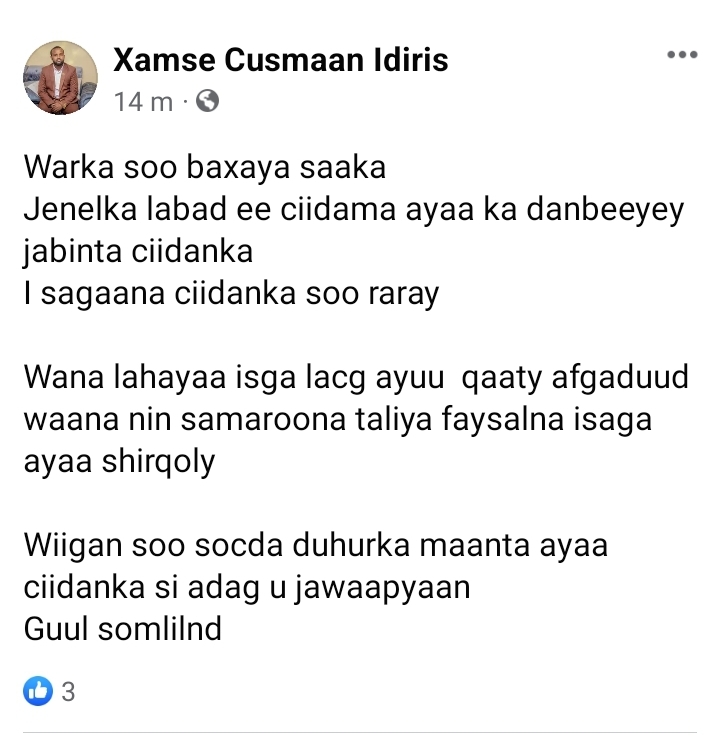 They'll talk today, you'll see them say this.they'll accuse usInadeer you concocted this pathetic excuse yourself. Somaliland press release would've said that instead of saying "Ciidanku way lumeen" which is even more pathetic