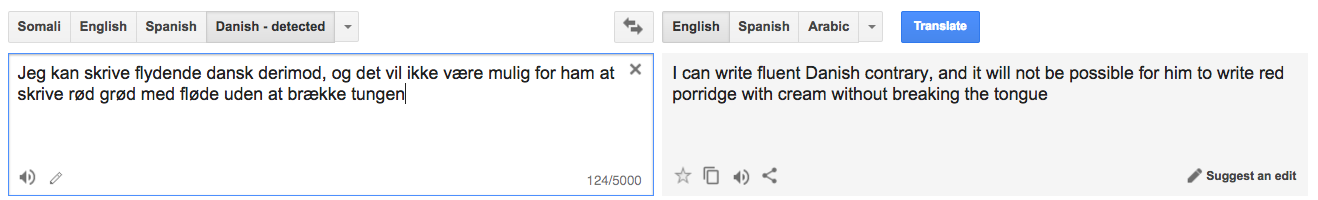 Jeg kan skrive flydende dansk derimod, og det vil ikke være mulig for ham at skrive rød grød med fløde uden at brække tungen. ;)