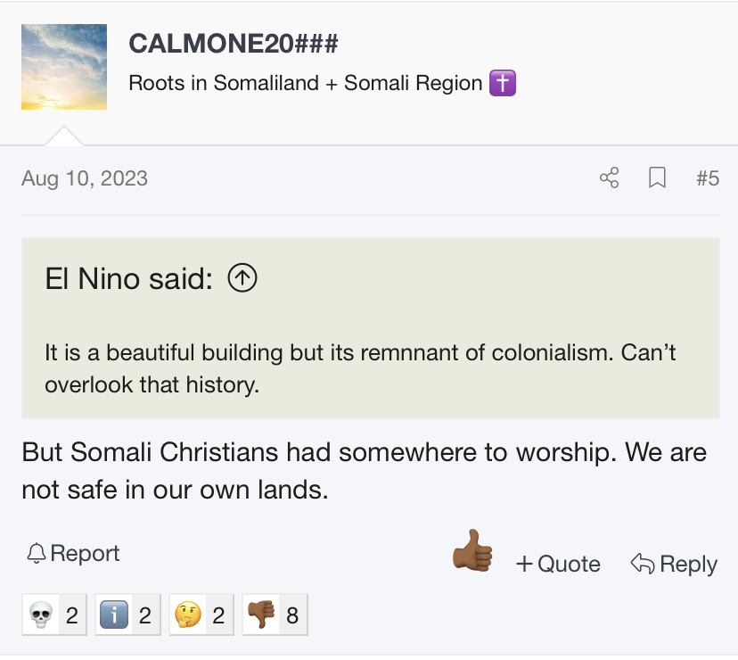 this is taking me out. “Somali Christians had a place to worship” Italians built it for themselves not for Somalis