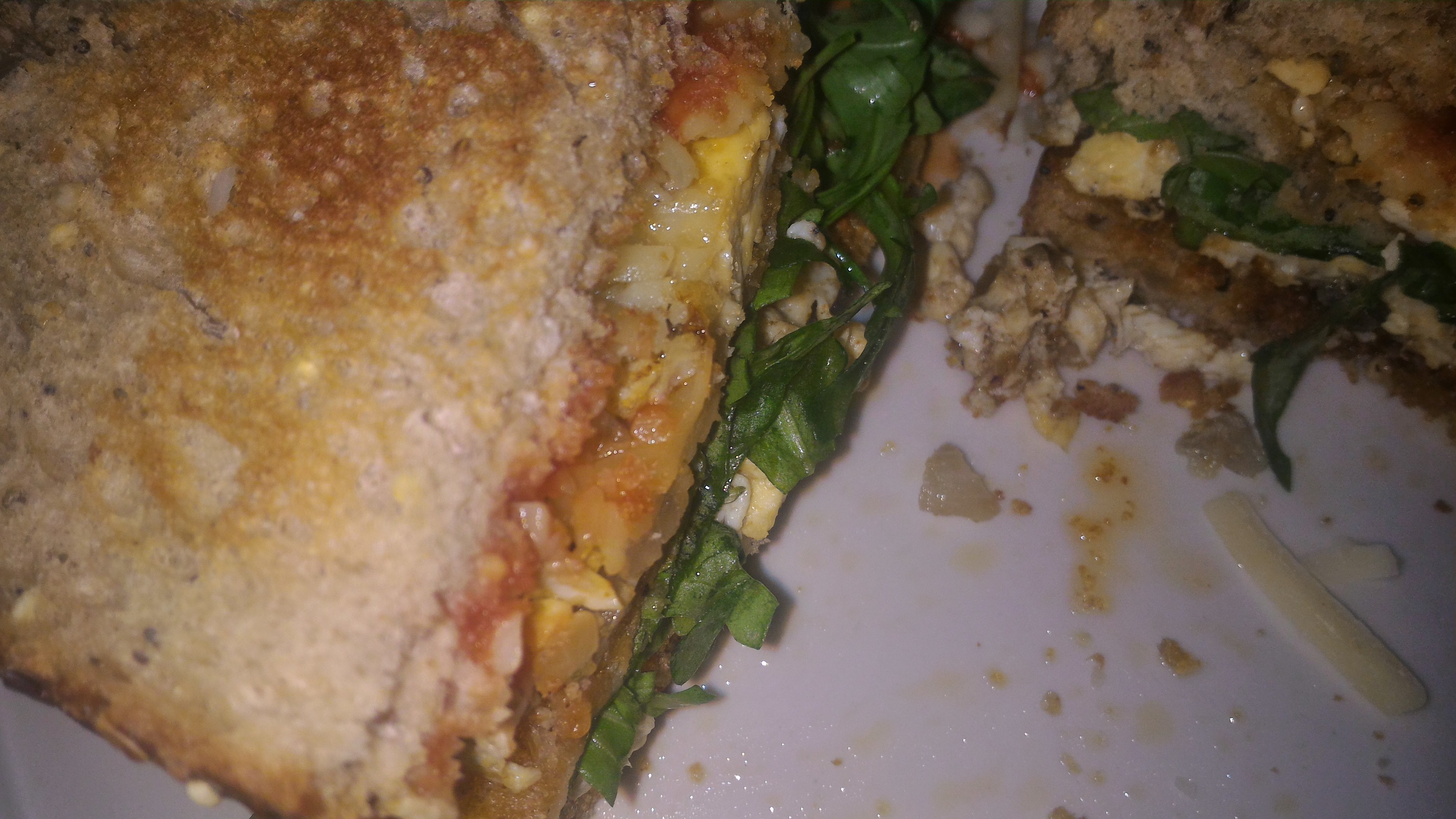 Three slices of seeded bread, slightly toasted with soft egg&onion scramble topped with cheese whilst the bottom slice has wild rocket leaves and more egg scramble.