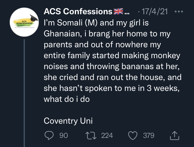 That Twitter account “ACSfessions” is definitely ran by madows who hate Somalis they pull these “confessions” out of their ass lol